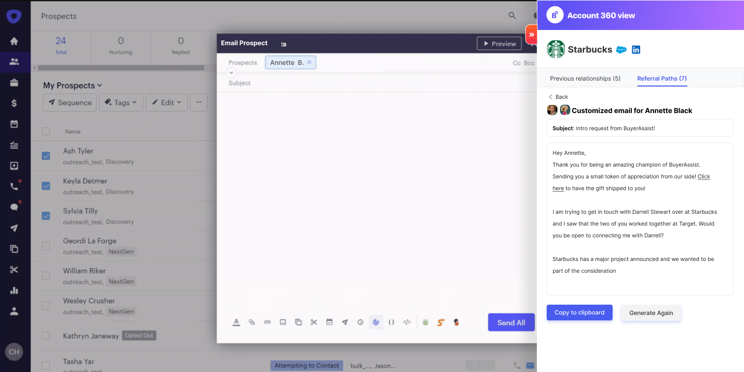 This module monitors email metadata, public profiles, and calendar connections to automatically detect when key contacts change jobs or when previous champions enter target accounts. These real-time signals feed high-confidence outreach plays, ensuring teams never miss a warm opportunity.