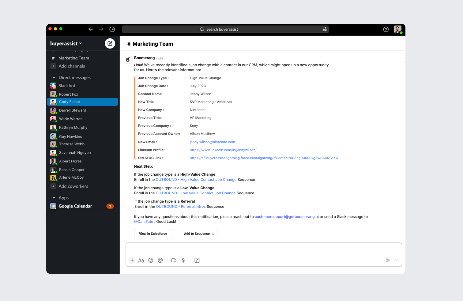 Built for modern GTM teams, Boomerang AI automatically detects job changes, maps champion relationships, enriches CRM data, and orchestrates personalized outreach plays - turning fragmented signals into actionable revenue opportunities.